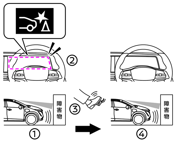 前進、または後退時、進行方向に車両や歩行者(後退時)、壁などの障害物を検知し、衝突するおそれがあるとシステムが判断すると、モーター出力の制御、およびブレーキをかけて衝突を回避、または被害の軽減をします。