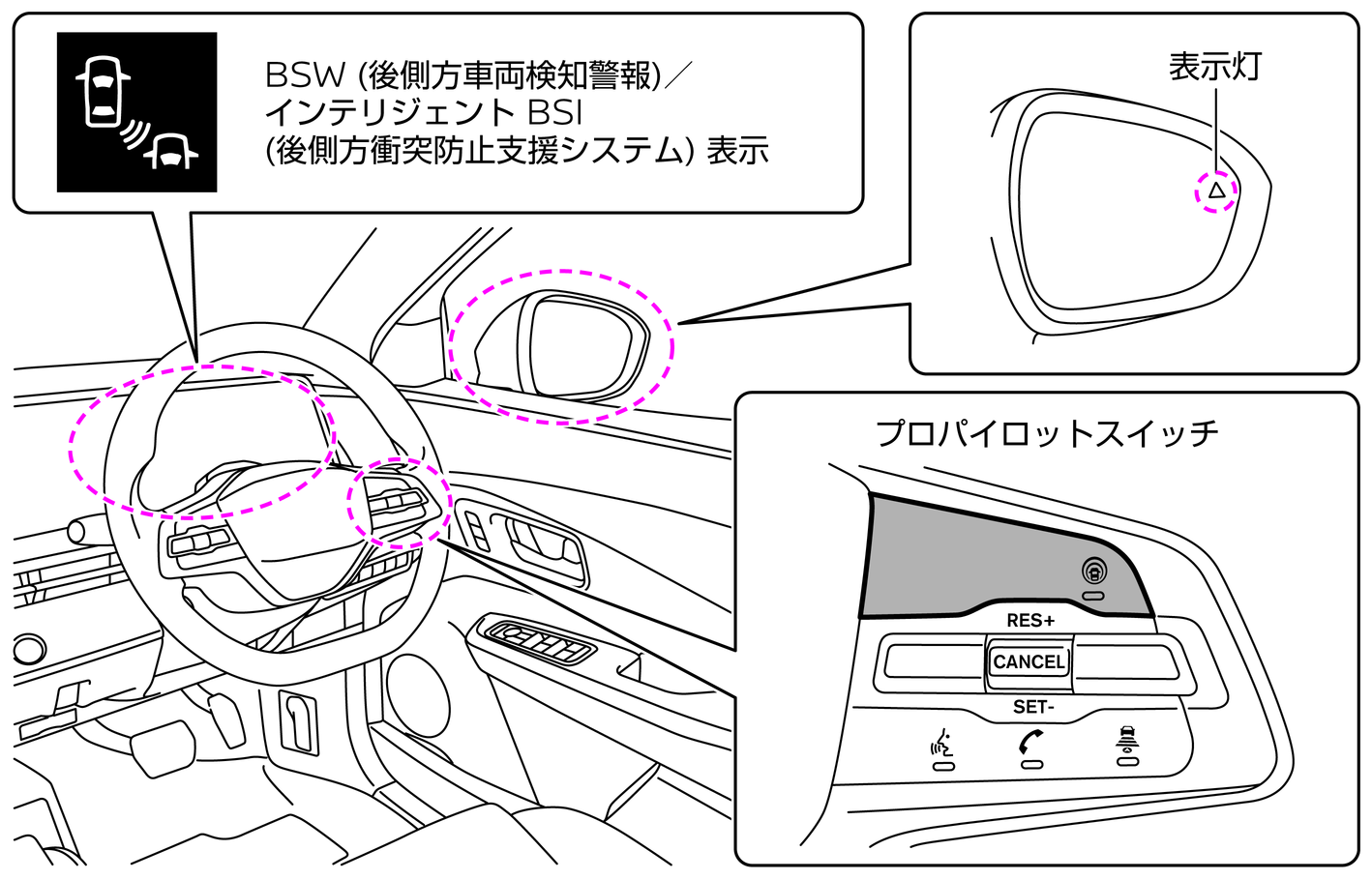 BSW(後側方車両検知警報)およびインテリジェント BSI(後側方衝突防 止支援システム)は、ドアミラーによる周囲の検知を代わりに行ったり、車両や障害物との接触を防いだりする機能ではありません。車線変更を行うときは、機能に頼った確認をせず、必ずドアミラーおよびルームミラーで側方および後方の安全を確認してください。
