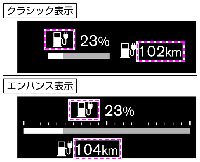 充電直後に表示される航続可能距離は、充電前の平均電費から算出されます。リチウムイオンバッテリーが満充電であっても平均電費により表示される航続可能距離が異なることがあります。