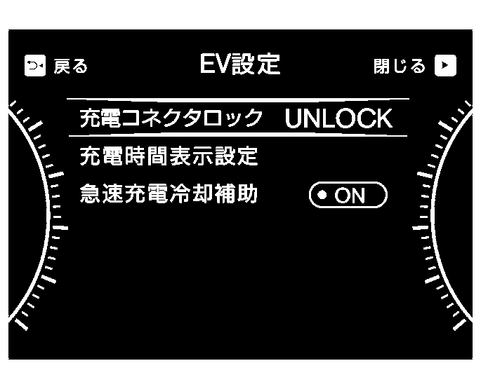 ステアリングスイッチのOKスイッチを回して、充電コネクタロックを選択し、OKスイッチを押して決定します。