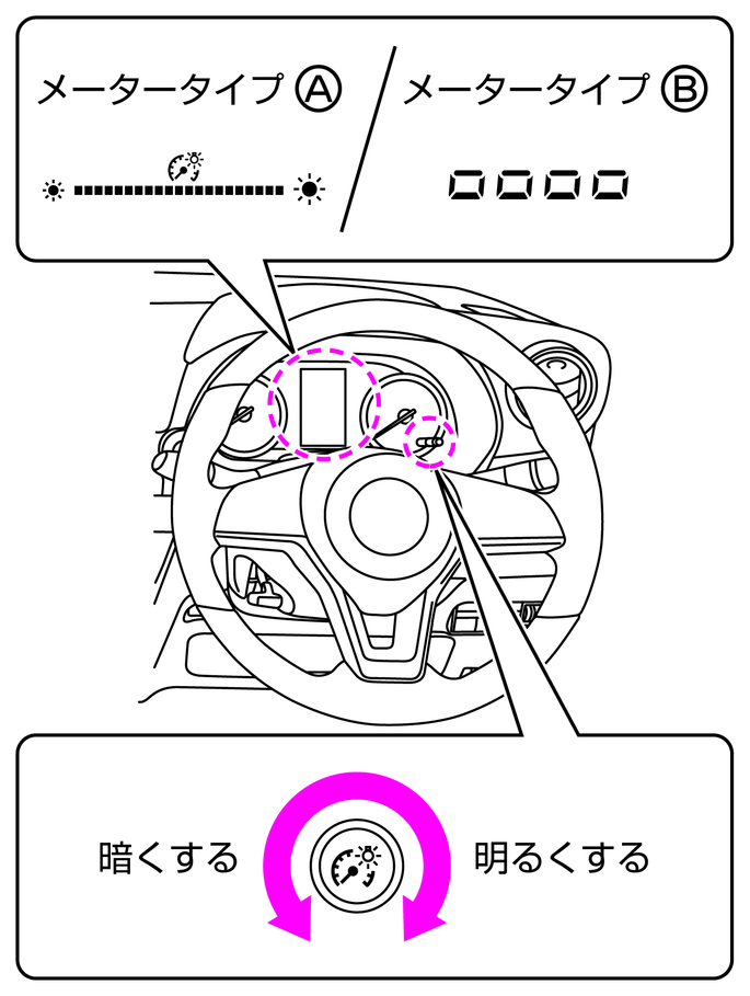 キースイッチ(電源ポジション)がONのときに、メーター照明の明るさを調節できます。