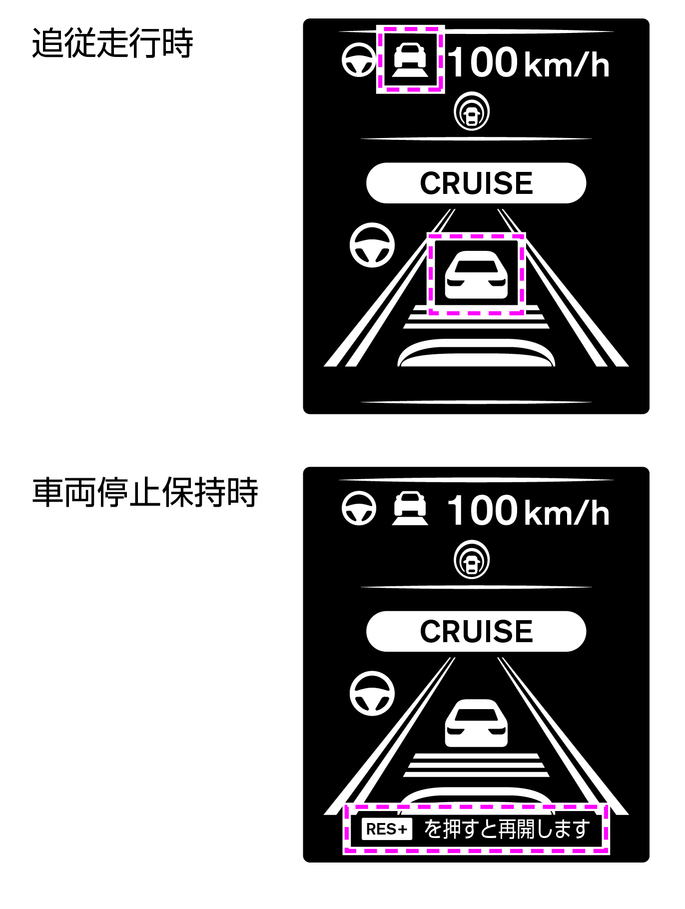 インテリジェント クルーズコントロールで走行中に先行車が停止したときは、先行車に続いて自車も停止します。一度停止すると、インテリジェント クルーズコントロールは停止した状態を保持します。(停止した状態を保持しているときは、「RES+を押すと再開します」と表示されます)