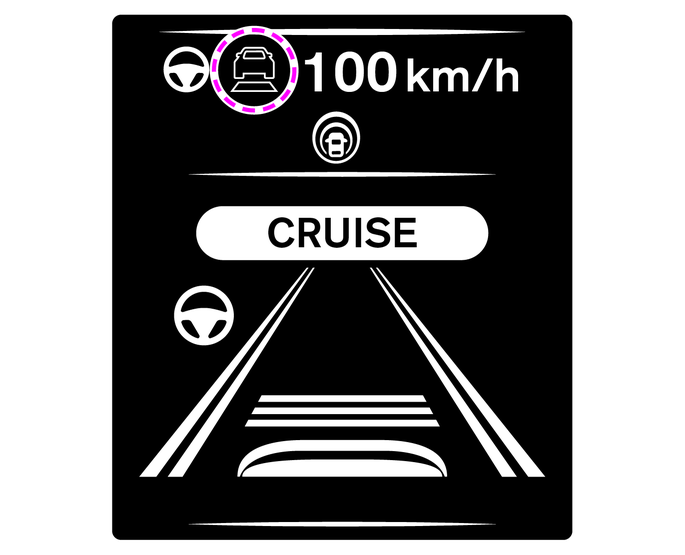 運転者がセットした車速(約30km/h~100km/h)を上限に、車速に応じた車間距離を保つように車間制御を行い走行します。先行車検出表示が点灯し、車速制御作動灯が定車間制御中表示(緑)で点灯します。