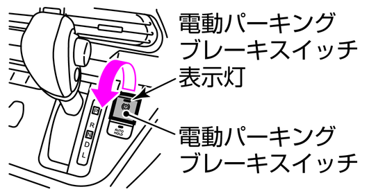 スイッチを引き上げると、電動パーキングブレーキスイッチの表示灯が点灯し、メーター内の電動パーキングブレーキ警告灯(赤色)