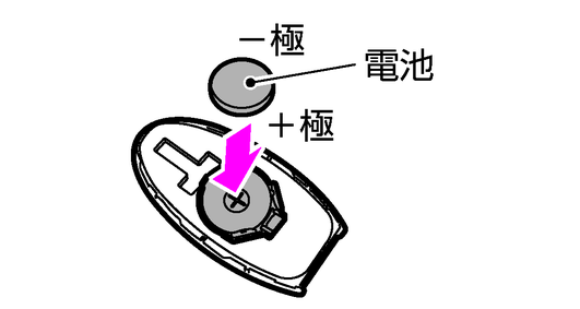 消耗した電池を取り外し、新しい電池をはめ込みます。(新しい電池は、+極を下にして取り付けてください。)