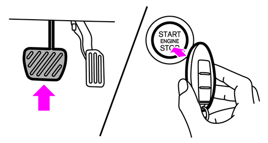 ブザーが鳴ってから10秒以内に、ブレーキペダル(A)をしっかりと踏み込みながら、エンジンスイッチ(B)を押します。