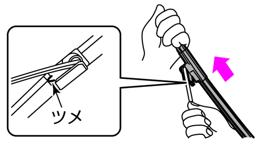 ワイパーブレードを矢印の方向に動かして取り外します。