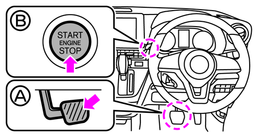 ブレーキペダル(A)をしっかりと踏み込みながら、エンジンスイッチ(B)を1回押します。