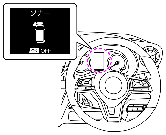 車両が障害物に近づくと、アドバンスドドライブアシストディスプレイのソナー表示色が緑 → 黄 → 赤の順に切り替わり、警報音(ブザー)が鳴ります。