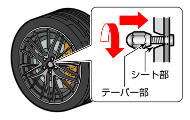 ナットのテーパー部が、ホイール穴のシート部に軽く当たるくらいまで、時計まわりに回して締め付けます。