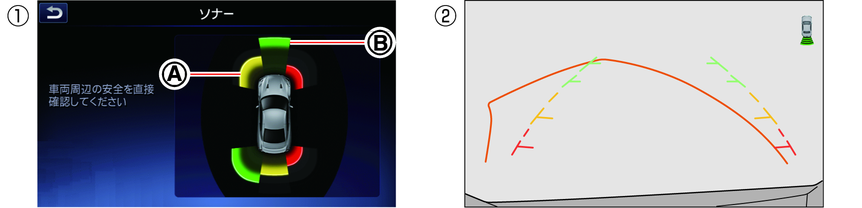 障害物との距離が近づくと、断続音の間隔が短くなり連続音になります。フロントソナーが検知したときは低音、リヤソナーが検知したときは高音でお知らせします。