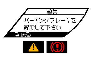 パーキングブレーキの解除のし忘れに注意してください。パーキングブレーキをかけたまま走行すると、パーキングブレーキ戻し忘れ警告とともにパーキングブレーキ戻し忘れ警報(パーキングブレーキ戻し忘れ警報)が鳴ります。