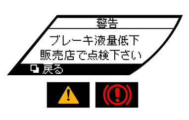 パーキングブレーキを解除しても点灯し続けるときは、点灯したまま走行しないでください。また、ブレーキ液が規定量以下になっていたら走行しないでください。ブレーキの効きが極度に悪くなり、思わぬ事故につながるおそれがあります。
