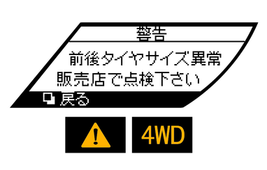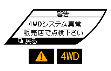 警告灯点灯時4WDシステムは、2WD又は弱4WDになりますが、通常の走行は可能です。ただしスピードは控えめにしてください。