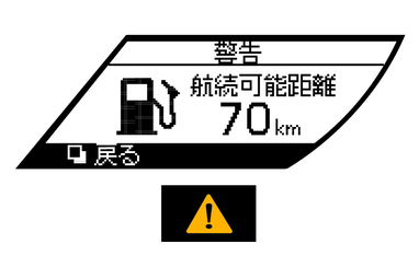 車両姿勢、走行状況によっては、燃料がタンク内で移動するため、警告を表示するタイミングが変わる場合があります。