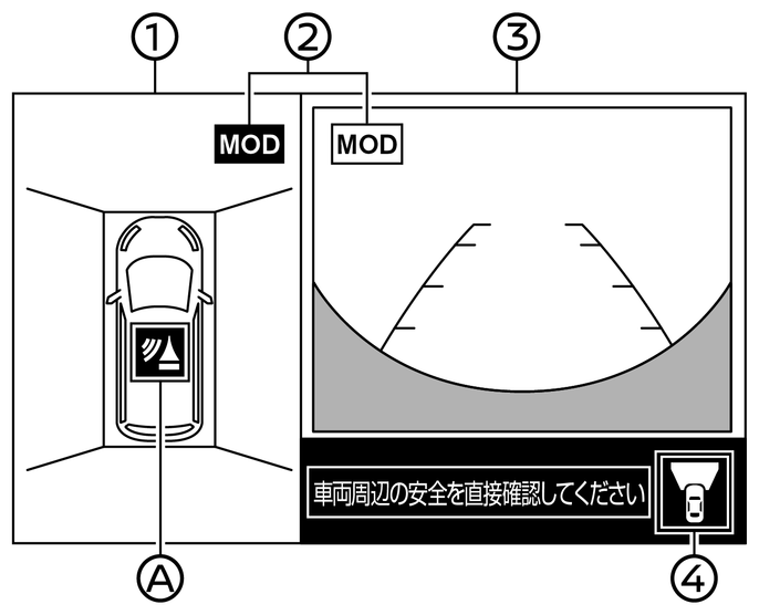 パワースイッチをONにしてから初めてインテリジェント アラウンドビューモニターを表示したときに、アイコン(A)の色と点滅(約3秒間)で、ソナーの作動状況を表します。