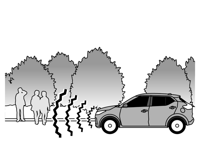 車両接近通報装置の音が聞こえないときは、安全で静かな場所に停車し、音が聞こえるか確認してください。ブレーキペダルを確実に踏みながら、シフトポジションをRにし、窓を開けて音が聞こえるか確認します。車両前方から音が聞こえないときは、日産販売会社で点検を受けてください。