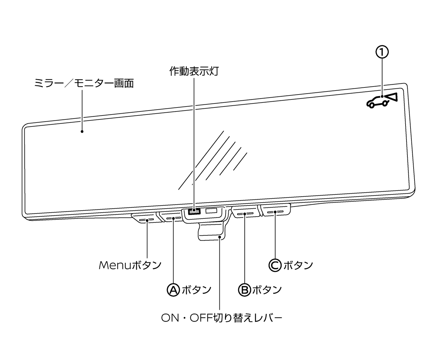インテリジェント ルームミラーのON・OFF切り替えレバーを車両前方側へ倒すと、モニター画面がOFFになり、ルームミラーモードとして使用できます。
