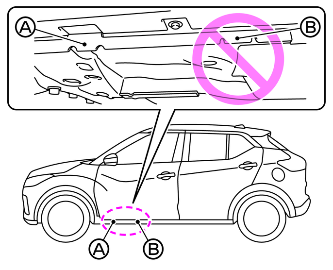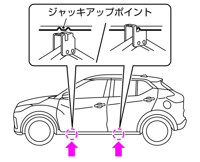 ジャッキアップポイント以外にはジャッキをかけないでください。車体が変形するおそれがあります。