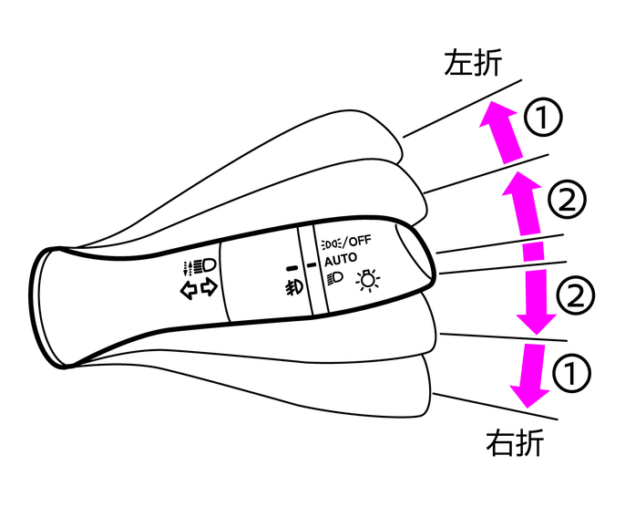 右折または左折するときは、ライトスイッチを(1)の位置まで動かします。