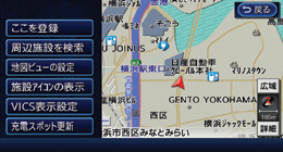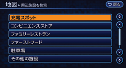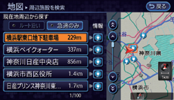 自車位置を中心とした周辺施設を近い順に最大100件まで表示します。
