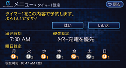 タイマーエアコンは、ナビ画面で出発予定時刻を設定して、充電ケーブル(EVSE)を接続すると、設定した出発時刻までに暖房または冷房が作動し、車内の温度を約25℃にします。(室内温度の設定はできません。)あらかじめ車内を快適な温度にすることで、エアコンの使用によるリチウムイオンバッテリーの電力消費量を減らすことができます。