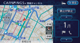 情報チャンネルを利用すれば、交通情報や天気などドライブに役立つ情報を受けることができます。情報を受信するとナビゲーション画面に表示され、自動的に内容を音声で読み上げます。