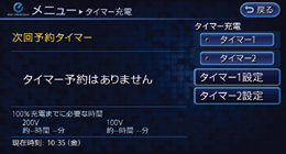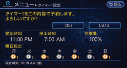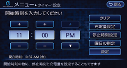 タイマー充電は、充電の開始時刻と停止時刻の両方または一方を設定でき、作動する曜日も設定できます。これらの設定は2パターンまで保存することができます。