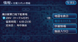 充電スポット情報の詳細や現在の位置などが更新されている可能性があります。目的地として設定される場合は、営業時間や充電設備などの情報をお客さま自身で確認されることをお薦めします。また、リチウムイオンバッテリー残量を考慮したドライブ計画を立ててください。