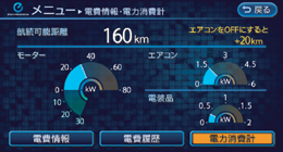 モーター、空調、電装品の消費電力を確認できます。また空調ON/OFFによる航続可能距離の増減も表示します。