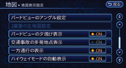 メニューボタン → 設定 → ナビゲーション → 地図ビューの設定 → 地図表示設定 → バードビューの夕焼け表示の手順でも設定できます。