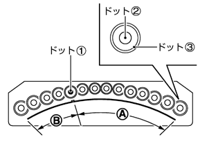 ドット(1)を起点として、出力電力は(A)の範囲、回生電力は(B)の範囲内でドット(2)が点灯します。(ドット(2)の数が多いほど、出力電力及び回生電力が多いことを示します。)