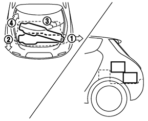 ラゲッジルーム内には2個のゴルフバッグを上下二段に重ねて収納できます。 一個目のゴルフバッグの上部をラゲッジルームの右側に入れ(1)、バッグ下部を(2)の方向に収めます。 2個目のゴルフバッグの上部をラゲッジルームの右側に入れ(3)、ゴルフバッグの下部を(4)の方向に収めます。