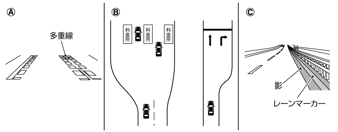 料金所や交差点手前などでレーンマーカーがない、またはレーンマーカーが大きく変化しているとき(B)