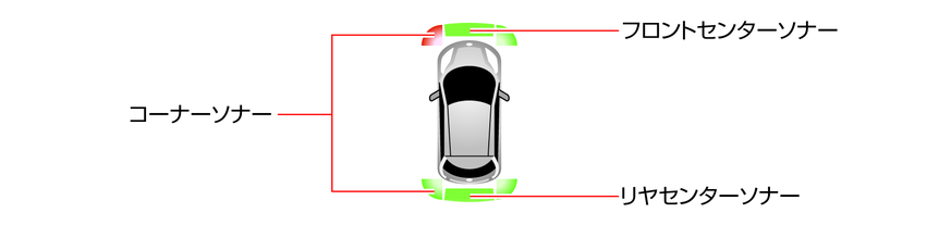 ソナーセンサーは前後バンパーについています。バンパーには、ステッカーを貼ったりアクセサリーなどを取り付けないでください。