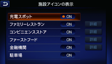 ナビゲーション → 施設アイコンの表示をタッチし、表示したい施設を選ぶ