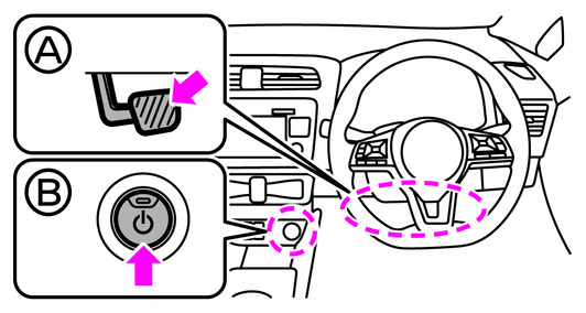 ブザーが鳴ってから10秒以内に、ブレーキペダル(A)をしっかりと踏みながら、パワースイッチ(B)を押します。
