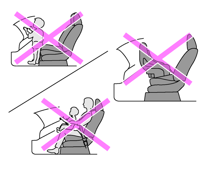 SRSエアバッグ格納部に手や足を置いたり、顔や胸などを不必要に近づけたりないでください。また、お子さまをSRSエアバッグ格納部の前に立たせたりひざの上に抱いたりせず、後席シートに乗せてください。