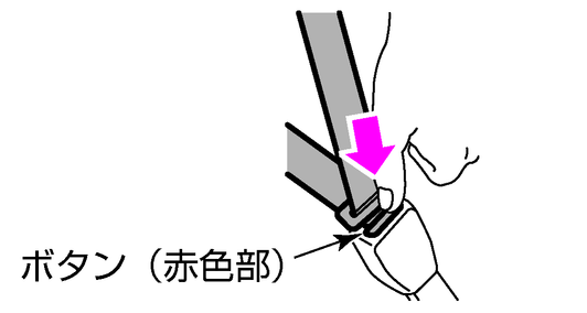 外すときは、バックルのボタンを押し、タングを持ってゆっくり戻します。