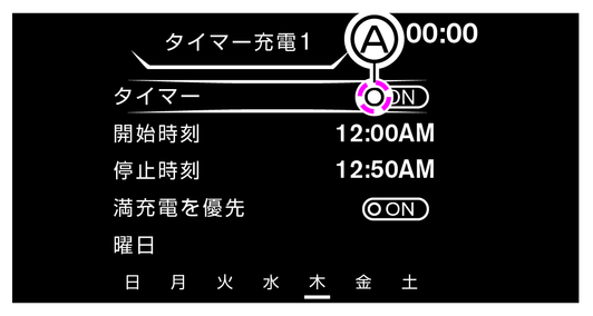 スイッチで、[タイマー充電1]または[タイマー充電2]を選択し、