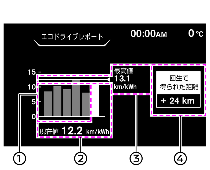 走行したルートのほとんどが下り坂だった場合、回生量が大きく、(2)現在値が99.9km/kWhになることがあります。