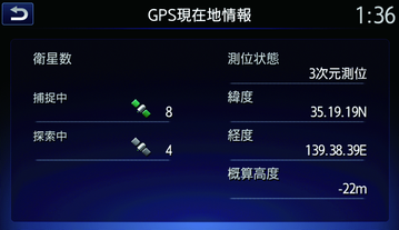 衛星数、測位(受信)状態、緯度、経度、概算高度を確認できます。
