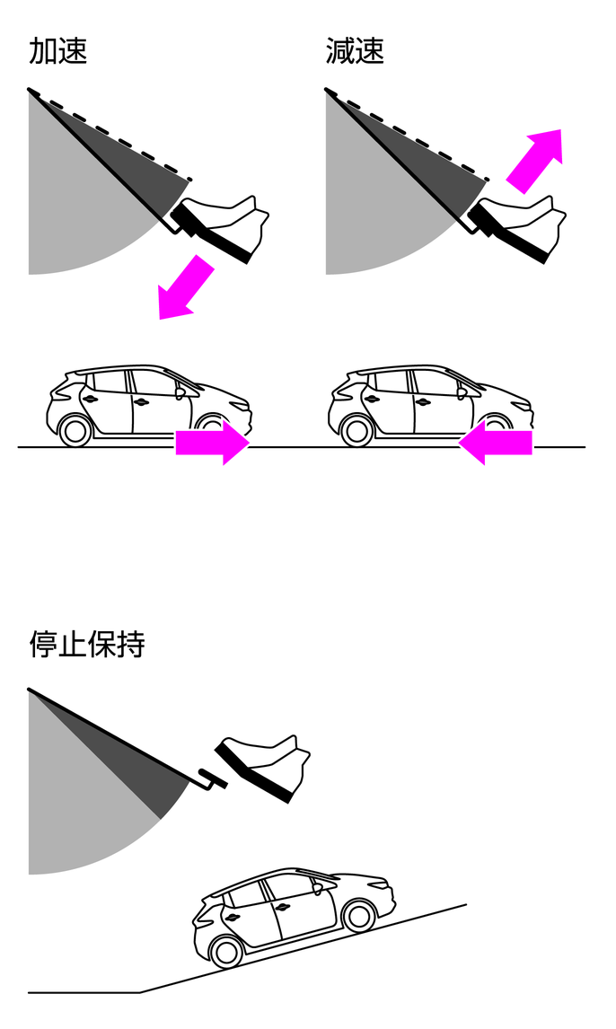 e-Pedalはアクセルペダルを離したときの減速度が従来の車より強いため、アクセルペダルを完全に離さず微調整することで、なめらかに減速することができます。
