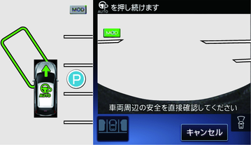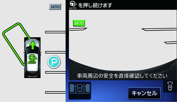 キャンセルをタッチすると車両が停止し、電動パーキングブレーキが作動してプロパイロット パーキングが終了します。駐車制御開始前にタッチすると、前の画面に戻り駐車位置の検出を再開します。