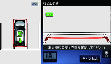 周りの状況をミラーや目視で直接確認し、周囲の車両や障害物、人に接触しそうな場合は、ブレーキペダルを踏み車両を停止してください。状況が改善しないときは、プロパイロット パーキングの使用を中断してください。画面上のキャンセルをタッチすると駐車制御を終了することができます。
