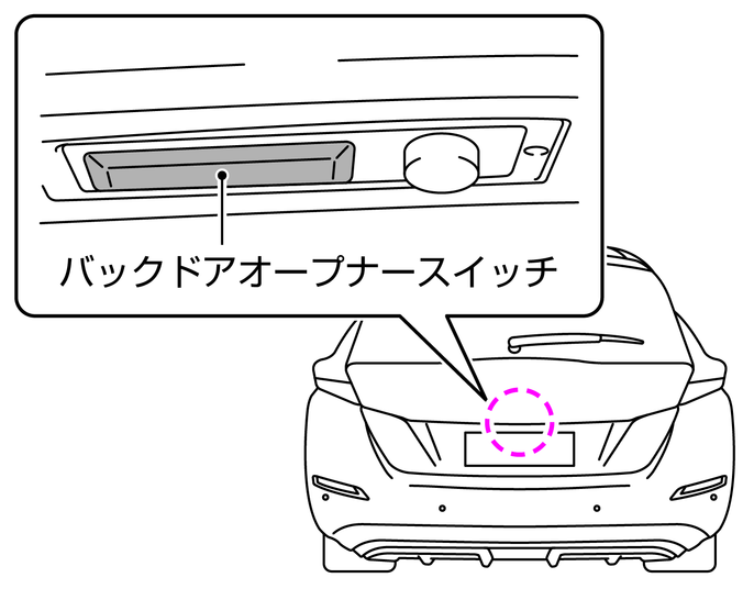 施錠されているときは、キー(インテリジェントキー)を携帯してバックドアオープナースイッチを押し、バックドアを持ち上げます。(ドアも同時に解錠します。)