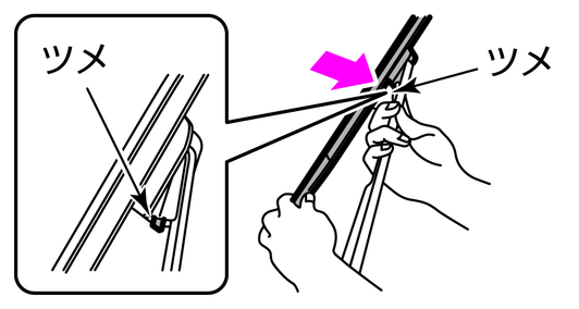 ワイパーブレードのツメを押したままにします。