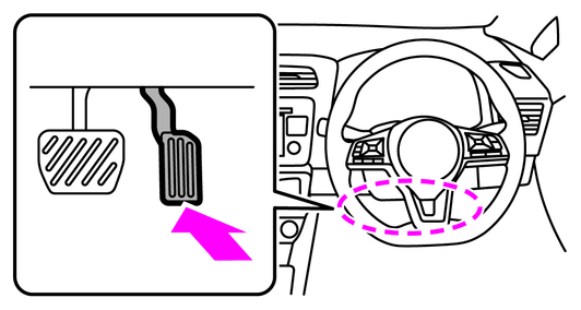 停車中、e-PedalがOFFのときはブレーキペダルをしっかりと踏む。e-PedalがONのときは、アクセルペダルから足を離すことで自動的に停車状態を保持するが、必要に応じてブレーキペダルを踏む。