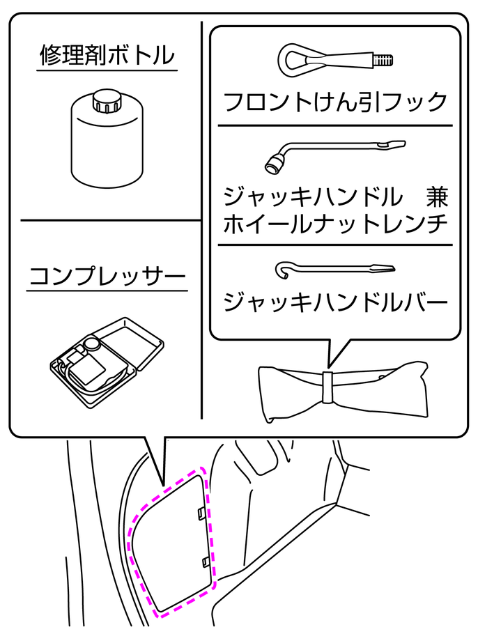 工具、ジャッキ★、タイヤ応急修理キットを使ったあとは、元の場所に収納する。