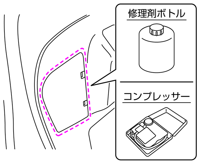 タイヤ応急修理キットは、ラゲッジルームに格納されています。